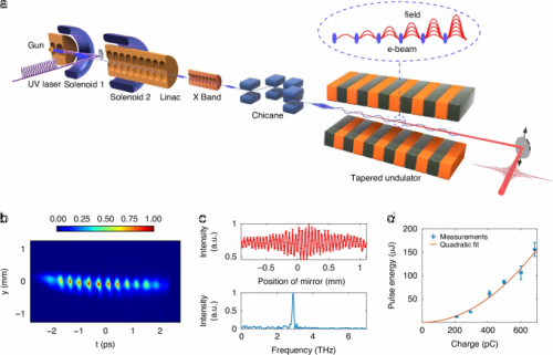 The layout of the experimental setup is shown in Figure 1a. A train of quasi-flat-top ultraviolet laser pulses generated by pulse stacking is directed onto the photocathode, producing a train of electron bunches with initial density modulation. Subsequently, these bunches undergo a space-charge oscillation process, transforming into periodic energy modulation that becomes increasingly pronounced during subsequent transport. By means of a downstream accelerator tube and an X-band harmonic cavity, the energy and energy chirp of the electron beam can be adjusted. The magnetic compressor located downstream then converts the energy chirp of the electron beam into density modulation at the target frequency, which is subsequently fed into the undulator to drive a super-radiant free-electron laser. Figures 1b through 1d respectively illustrate the longitudinal density modulation of the electron beam measured by a deflection cavity, the spectral characteristics of the radiation, and the relationship between the radiation pulse energy and the square of the charge. These results not only confirm the coherence of the radiation but also demonstrate that increasing the charge can further enhance the radiation energy.