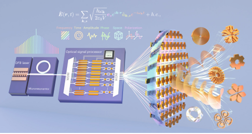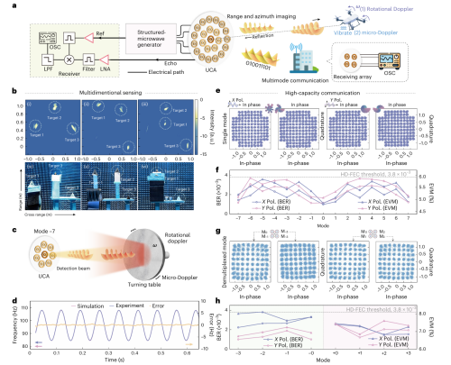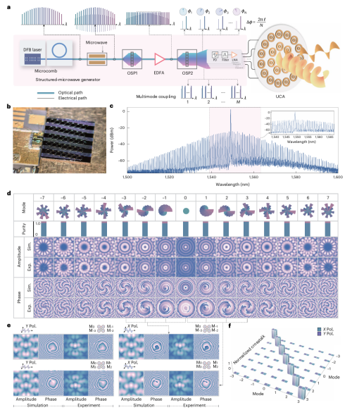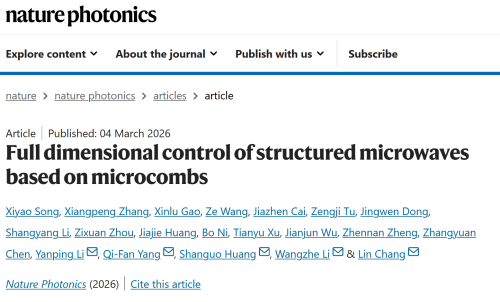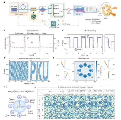 Structured electromagnetic waves, with their rich degrees of freedom, hold tremendous potential in both fundamental research and practical applications. However, in the microwave frequency band, harnessing these dimensions has traditionally required bulky hardware and complex systems—each dimension often necessitating its own dedicated, specialized equipment for generation, manipulation, and control. This level of complexity has constrained the performance and scalability of structured microwaves, posing a major barrier to their widespread adoption. Recently, a team led by Chang Lin at Peking University—including Yanping Li, Qi-Fan Yang, and others—jointly with Li Wangzhe from the Innovation Academy for Space-Air Information of the Chinese Academy of Sciences, as well as Huang Shanguo from Beijing University of Posts and Telecommunications, published a paper in Nature Photonics presenting a microcomb‑driven microwave photonic antenna array that enables full‑dimensional control of structured microwaves. By modulating a large number of mutually coherent optical comb teeth, this approach allows for the simultaneous, arbitrary manipulation of all dimensions of structured microwaves in a programmable manner using just a single set of hardware, significantly reducing system complexity. The researchers demonstrated a range of functions for structured microwaves that were previously unattainable: including ultra‑multimode vortex microwave synthesis, sub‑microsecond‑level spatiotemporal mode switching, broadband phase–frequency response tuning, wide‑angle two‑dimensional beam scanning, and the most comprehensive multi‑dimensional coupling capabilities to date. This breakthrough paves the way for the development of integrated sensing–communication systems based on structured microwaves: offering 6G networks an ultra‑high communication spectral efficiency of 210 bit s⁻¹ Hz⁻¹ while enabling vortex sensing capable of detecting four‑dimensional information.