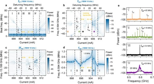 The research team has, for the first time experimentally, achieved optical mutual injection locking between a terahertz-band single-mode quantum cascade laser and a frequency-comb quantum cascade laser. The two quantum cascade lasers are fabricated on the same epitaxial wafer and mounted face-to-face on a Y-shaped cold finger, enabling bidirectional optical coupling. In the experiments, by adjusting the current bias, the team can tune the operating states of the single-mode quantum cascade laser and the frequency-comb quantum cascade laser, control their frequency difference, and thereby switch the system from an unlocked state to a locked state. In the unlocked state, the two lasers exhibit weak coupling, resulting in beat notes between the single-mode laser and the teeth of the frequency comb and generating a series of radio-frequency signals (fbn). Under MOI locking, the single-mode quantum cascade laser is aligned with the frequency-comb tooth closest to it, causing the fbn signals to disappear and leaving only stable intermodal beat signals (frep and its harmonics); the locking bandwidth is denoted by Δflock.